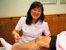 痛みのある部位に通電することにより除痛や筋緊張を軽減させる効果があります。
